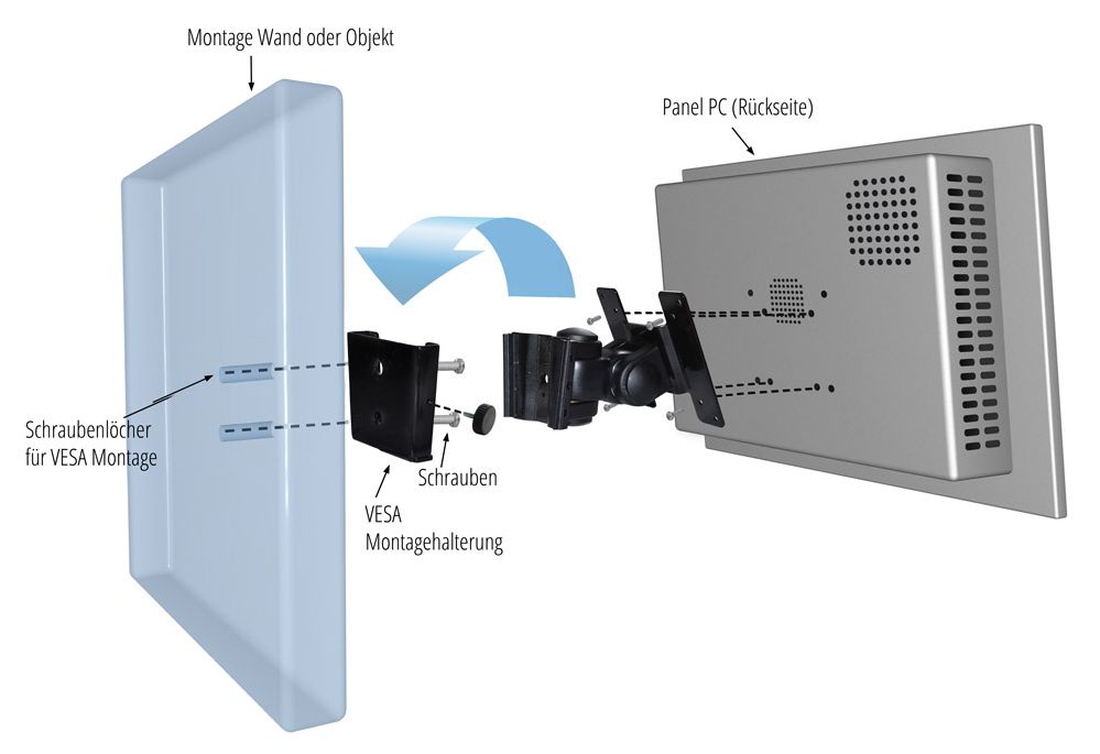 Hochwertige Panel PCs bedürfen einer ebenso hochwertigen Befestigung. Deshalb haben wir für jedes Einsatzgebiet die passende Befestigungsart parat - ob eine fixe Montage an der Wand, verschiedenste VESA-Halterungen mit und ohne Gelenk, oder eine individuell angefertigte Befestigung. Ein Beispiel: Für den Einsatz in der Gebäudeautomation eignet sich besonders die Wall-Mount-Montage. Hierbei wird das System ohne Gehäuse in ein passendes Loch an einer beliebigen Stelle wie beispielsweise einer Wand gesetzt und von vorne verschraubt. Danach wird ebenfalls von vorne eine aufsetzbare Frontblende, z.B. mit Clips oder Magneten, befestigt. Das verhindert einerseits unschöne Schraubenköpfe, hat andererseits aber den praktischen Nutzen, das der Panel-PC bei Wartungsarbeiten sofort erreichbar ist. Egal ob Sie sich für eine der normierten VESA-Befestigungen entscheiden oder eine individuelle Halterungs-Lösung suchen. Dank unserer jahrzehntelangen Erfahrung sind wir der ideale Partner, wenn es um die richtige Befestigung Ihres Panel-PCs geht. Sollte die gewünschte Halterung dabei nicht in unserem Angebot enthalten sein, helfen wir Ihnen mit unserer reichen Erfahrung aus zahlreichen, erfolgreich umgesetzten Projekten gerne weiter. Unser Beraterteam steht Ihnen jederzeit für eine Anfrage zur Verfügung. Für einen ersten Überblick finden Sie nachstehend eine kurze Erläuterung der gängigsten Befestigungs-Methoden.