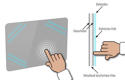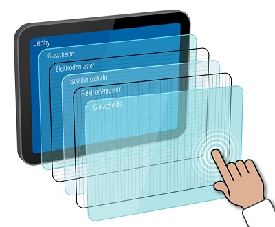 Diese Touchscreen-Technologie arbeitet mit zwei rasterförmigen, ITO-beschichteten Lagen aus Polyethylen oder Glas, die ein elektrisches Feld erzeugen. Da die beiden Schichten direkt mit dem Sensor verbunden sind, wird jede Berührung unmittelbar auf das elektrische Feld projiziert. Die dabei verursachte Kapazitätsänderung lässt sich genau erfassen, wobei auch mehrere Berührungspunkte erkannt werden können.