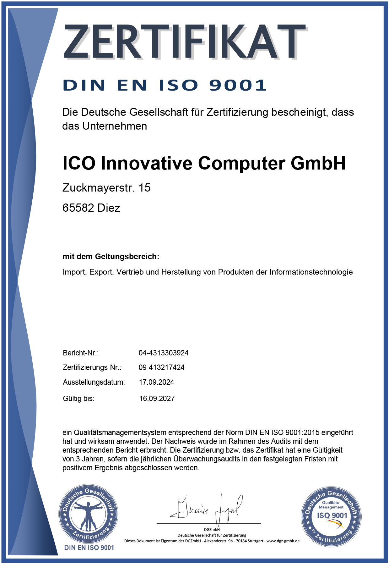 ICO Innovative Computer GmbH erhält Zertifizierung Din EN ISO 9001:2015 mit dem Geltungsbereich: Import, Export, Vertrieb und Herstellung von Produkten der Informationstechnologie.